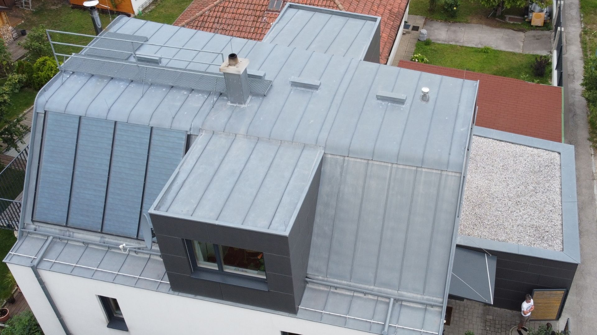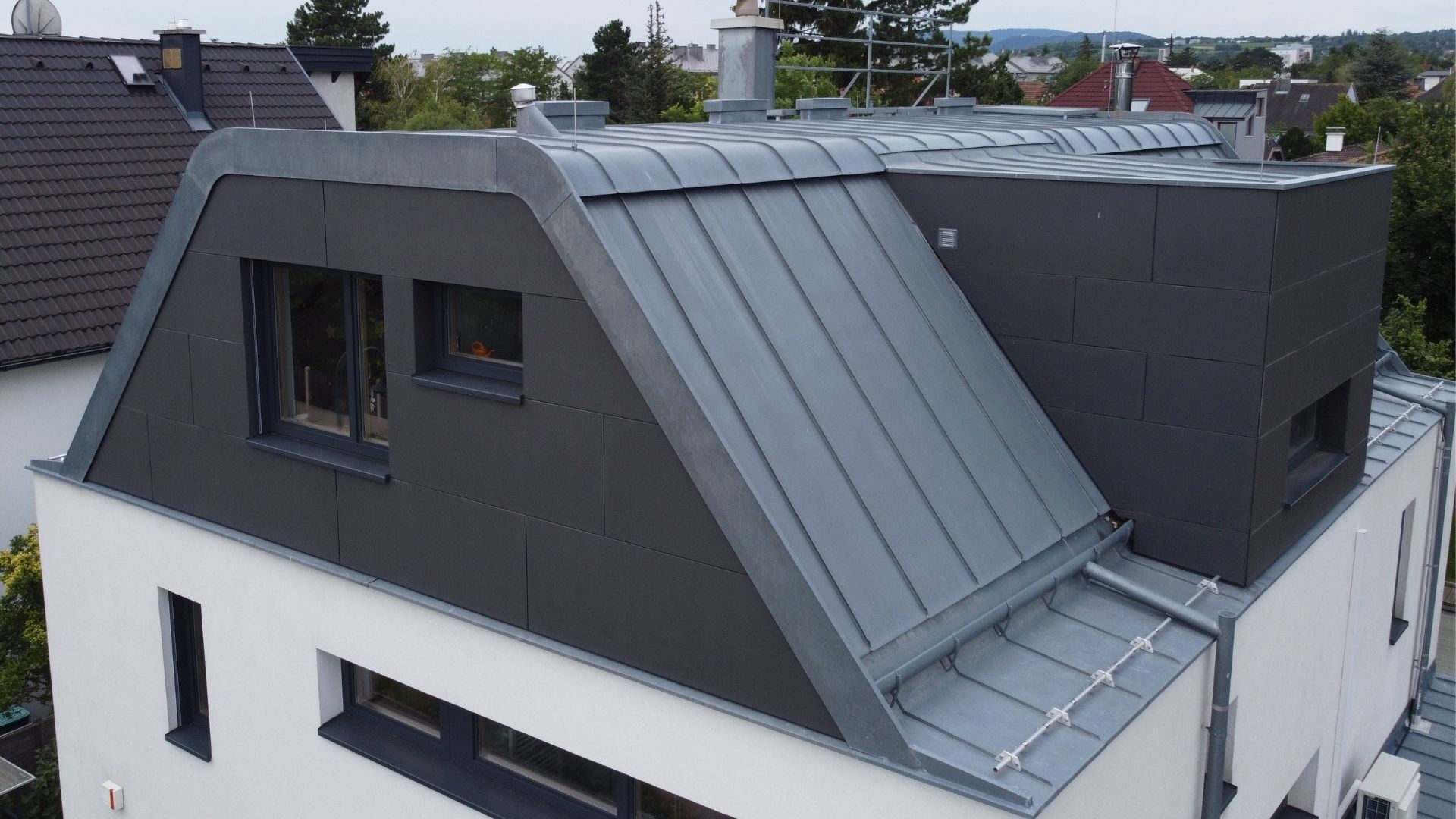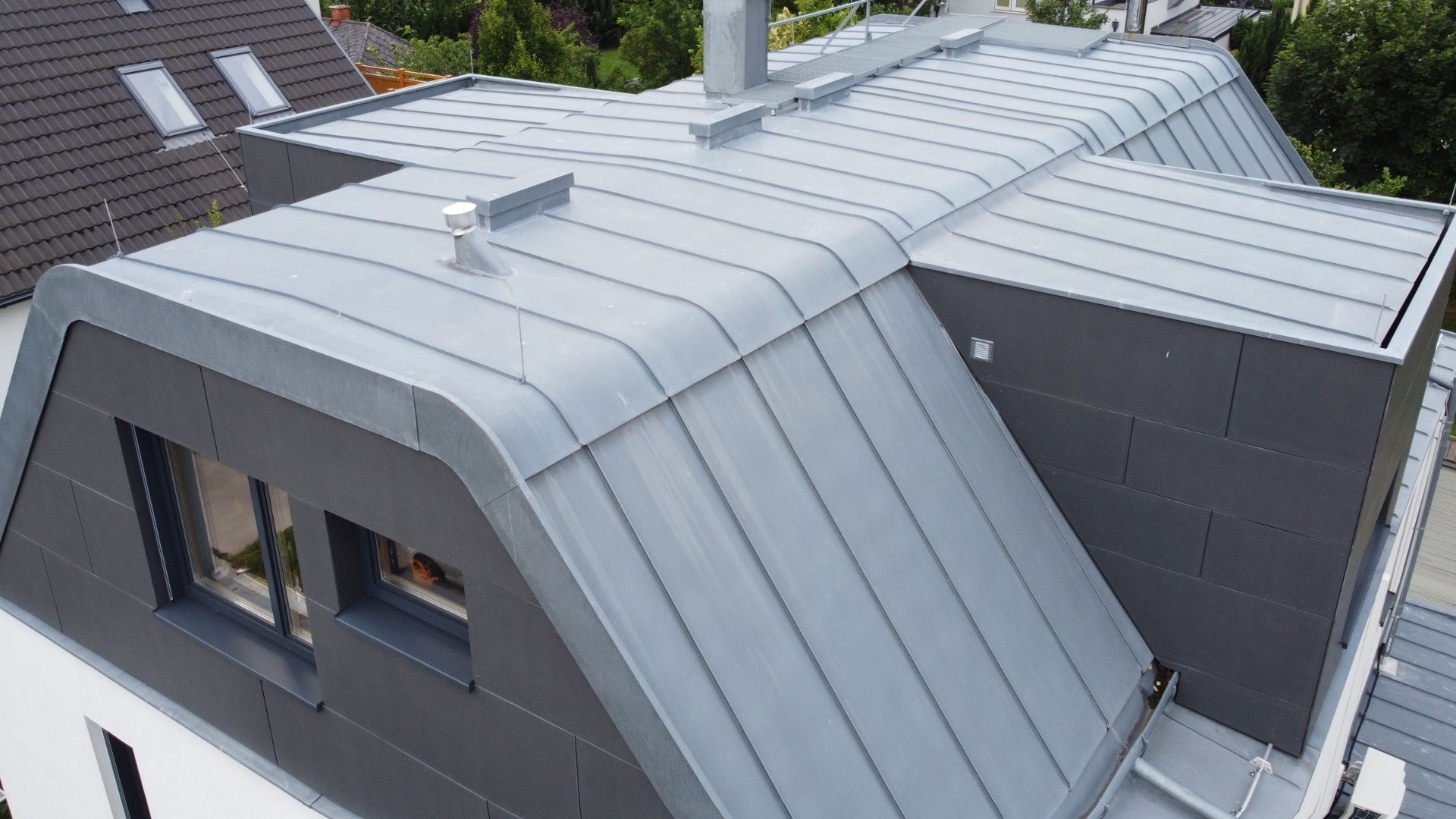 Blechdächer sind seit einiger Zeit besonders im Trend. Ein Blechdach zeichnet sich durch Bruchfestigkeit, Beständigkeit und wegen der korrosionsfreien Materialien durch Wartungsfreiheit aus. Das Blech wird auf einer Holzschalung in Bahnen montiert. Die Vorteile eines Blechdaches sind eine lange Lebensdauer, relative Sturmsicherheit und seine schnelle Verarbeitung. Die Materialwahl ist je nach Farbgestaltung variabel: Das Dach kann mit Kupfer, Uginox, Roofinox, Titanzink oder Aluminium in verschiedenen Farben gedeckt werden.